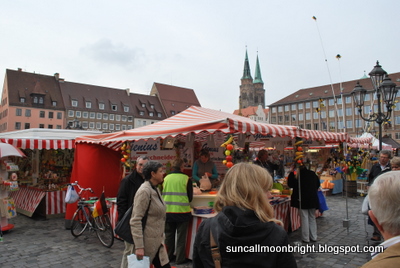 Having left our final morning at Oktoberfest in Munich, we went back to our hotel at the Ostbahnhof, got our bags and moved on to our next destination, Nuremberg (Nürnberg). Founded sometime in the 11th century, the old part of the city still has most of its medieval fortifications: walls, towers, and including the Imperial Castle on a knoll. It was an important city during the era of the Holy Roman Empire as the Imperial Diets (Reichstage) and courts met in the castle. In modern times, Nuremberg is also where the Nazis were trialed for war crimes after WWII. Another thing that makes this city unique is the long line of market stands along the King's Street (Königstraße) from St. Lorenz church to the main market (Hauptmarkt).