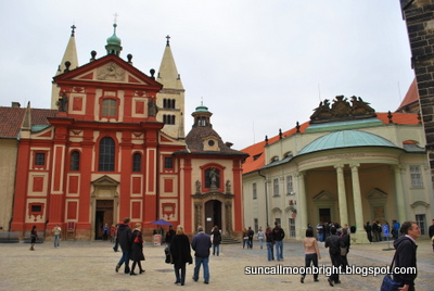 Left, St. George's Basilica (Czech: Bazilika Sv. Jiří), the oldest church building in Prague Castle since 920 CE where princes are buried.